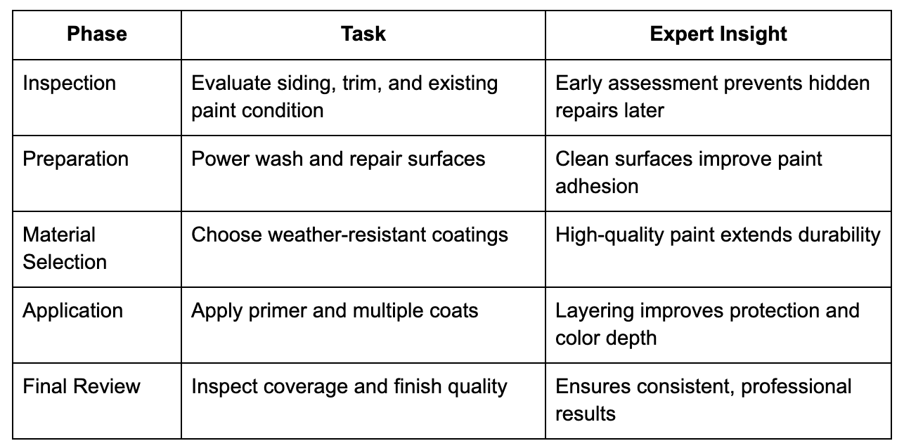 Reliable exterior paint contractors follow a structured workflow to deliver durable results. The process focuses on preparation, precision, and protective coatings that extend paint life.